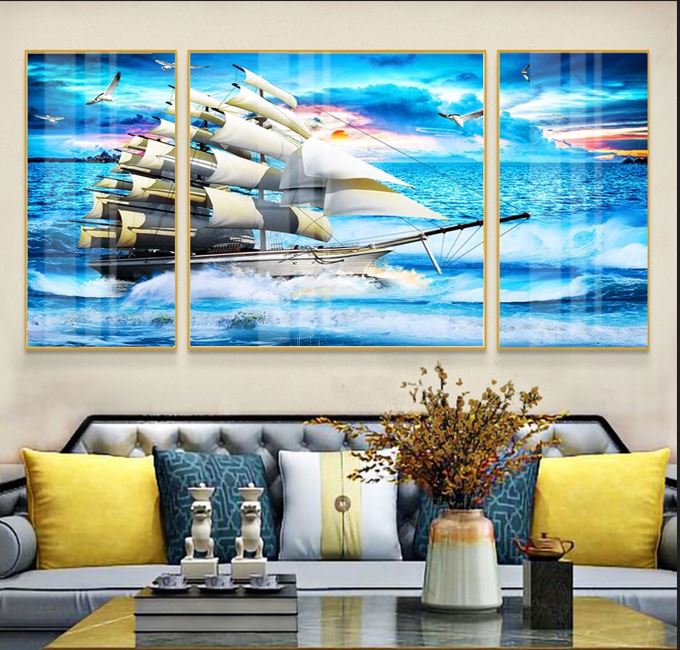 Mô tả: Tranh được thiết kế tinh tế với tranh hình vuông ở giữa làm tâm điểm, nổi bật; hai tranh hình chữ nhật ở hai bên ghép vào có sự ăn khớp về nội dung tạo nên bộ tranh thuận buồm xuôi gió 03 bức có vẻ đẹp hoàn hảo và uyển chuyển.
